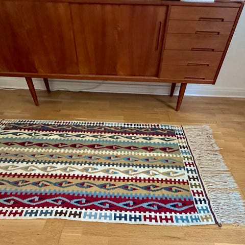 Finmönstrad kelimmatta. Längd: 300 cm och bredd: 200 cm. Fraktas ej, utan hämtas på plats.