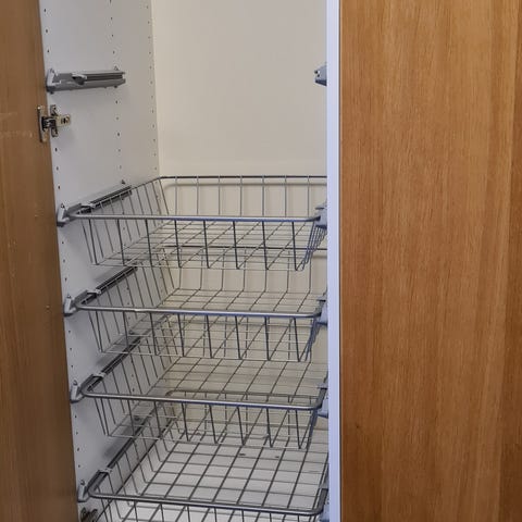 Bra garderob med sex utdragbara backar samt hyllplan höst upp.