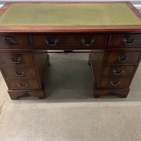 Säljer ett välbevarat engelskt skrivbord i idegran pga flytt. Grön läderklädd skrivyta med guldkant. Handtag i mässing.