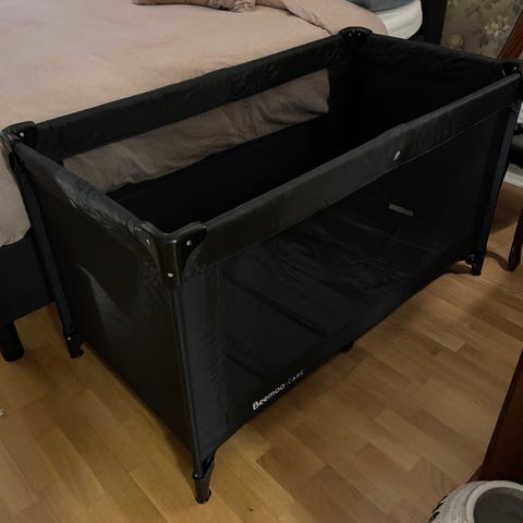 Jollyroom Resesäng i svart färg. Praktisk och portabel sänglösning för barn, lämplig för resor och tillfälliga sovplatser.