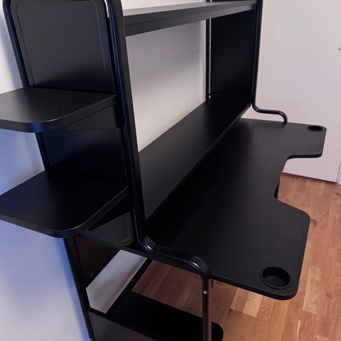 Bordet kan designas omg lite med att flytta hyllor osv, jag har även två små hyllor till bordet som jag inte använder så de syns inte på bilderna. Under bordet finns två plan för att ställa datorn.