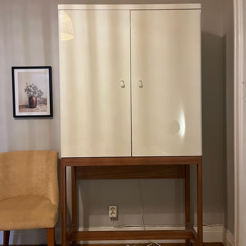 Skåp med front i spegelglas och stomme i vit Mdf, som hängs på väggen. Inredning i sammet. Låsbart. Massa smart förvaring för smink och smycken.