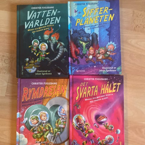 Författaren Christer Fuglesang. Tre böcker Det. Svarta hålet, Vattenvärlden och Rymdresan. Böckerna är illustrerade och riktar sig till barn.