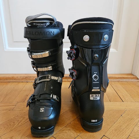 Ett par svarta alpinpjäxor från Salomon med styvhet 120 i schysst skick. Storlek 27,5 vilket motsvarar ungefär 42-43. Använda 2 säsonger.