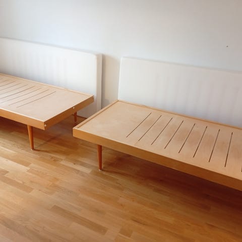 Vit i trä/mdf. Passar säng (140)-180. Inbyggd hylla på var sida är även sängbord och förvaring under. Öppningen mäter 124 cm och en 140 cm säng täcker. Hyllhöjd 52 cm. Ryggdelen demonterbar.