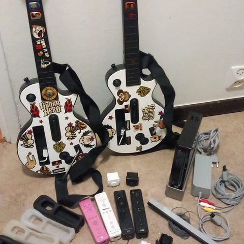 Wii med 2 kontroller och 2 joystick. Gitarr hero spel samt dansplatta. Alla kablar finns plus lite andra spel enl bild.
