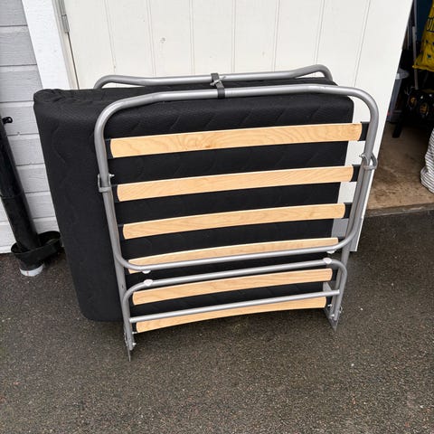 Sparsamt använd extrasäng som viks ihop och kan gömmas undan när den inte används. Själva tyget runt skummadrassen har gått upp lite i sömmen. Påverkar egentligen inte funktionen och man använder ju dessutom normalt ett lakan ovanpå så då blir det ju inte märkbart, men annars sys ju detta ihop med enkelhet.