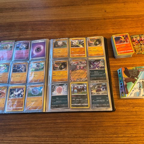 Set med Pokémon samlarkort förvarade i plastfickor i en pärm.