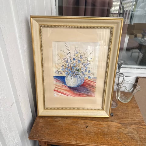 Inramad akvarell med motiv av röda blommor i vas. Akvarellen är placerat i en guldfärgad ram med passepartout och glas 32*23 cm. Passar för väggdekoration i olika rum.