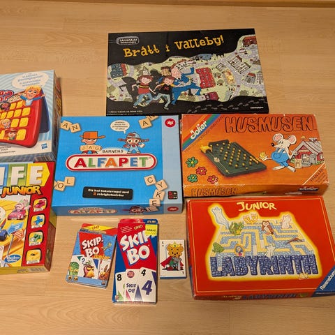 Säljer ett paket med 8 barnspel enligt bild. Perfekt för familjekvällar, kalas eller som påfyllning till spelhyllan. Blandade spel för olika åldrar.