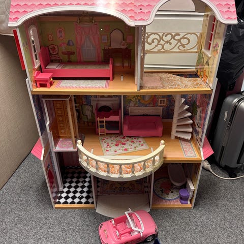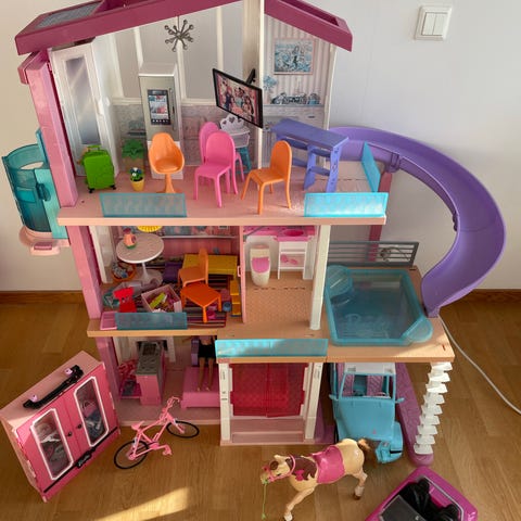 Barbie Dockhus med flera rum och olika tillbehör inklusive möbler, dockor och bilar. Passar för barn som gillar rollspel och kreativ lek.