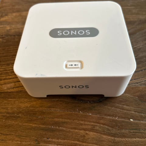Sonos Boost nätverksförstärkare i vit färg. Enheten används för att förbättra trådlös nätverksprestanda för Sonos ljudsystem. Utrustad med Ethernet-portar för anslutning till router och Sonos-enheter.