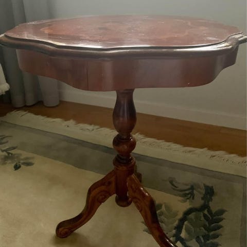 Ett antikt Pelarbord med marmorskivor i grön nyans och ben i trä med dekorativa detaljer. Bordet har en rektangulär form och är lämplig som avlastningsbord eller dekorativ möbel.