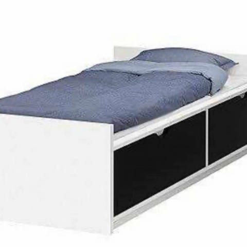 IKEA säng med sänggavel och integrerade förvaringslådor under sängen. Sängen har en mörk färg och är avsedd för användning i sovrum. Förvaringsutrymmet under sängen ger extra plats för förvaring av till exempel sängkläder eller andra föremål.