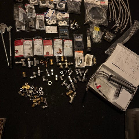 Samling av VVS-komponenter inklusive blandare, kopplingar, ventiler och monteringsdetaljer. Innehåller olika typer av rördelar och beslag i metall samt installationsanvisningar. Passar för diverse VVS-installationer och reparationer. Tar Swish. Finns i sjömarken