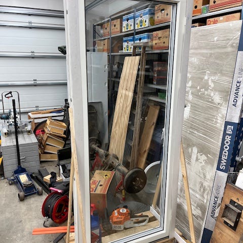 Vit, vänsterhöngd altandörr i trä, 3-glas med måtten 9x21 M.