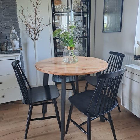 Matgrupp med fyra klädda stolar. Bordet har en iläggs-