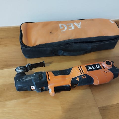 Bosch PMF 220 CE multiverktyg med hållare för slipning och distans. Verktyget levereras med en förvaringsväska och manualer. Multiverktyget är elektriskt och har en kabelanslutning.