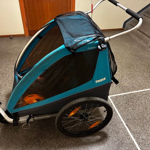 Supersmidig cykel- och barnvagn som barnen sitter bekvämt i. Barnvagnshjulen kan enkelt förvaras på cykelvagnen när den används och sen snabbt kopplas på för barnvagnsfunktion. Vagnen är även lätt att fälla ihop. Cykelvagnen är i fint skick då den är sparsamt använd och förvarad inomhus.
