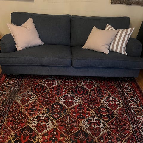 Mysig grön Howard 3-sits soffa i tåligt och lättskött material med träben och mässingshjul. Hämtas innan onsdag morgon 20/2.