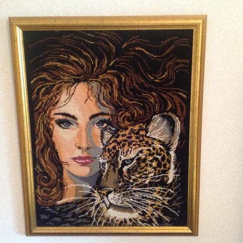 Broderi tavla föreställande en kvinna med långt hår och en svart häst mot en bakgrund med himmel i solnedgångsfärger. Tavlan är inramad i en enkel guldfärgad ram.
