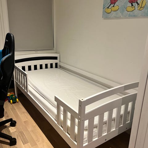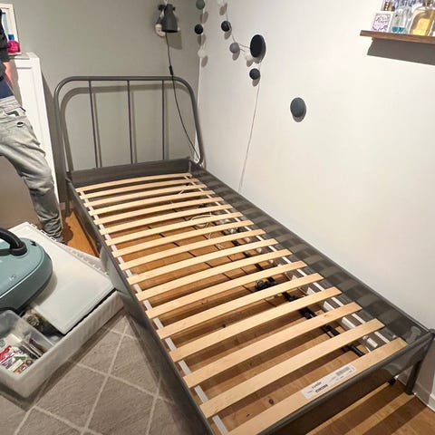 IKEA sängram i svart trä med robust konstruktion. Passar för madrass och ger stabilitet och stöd. Enkel design med slatta detaljer i trä. För madrasser 90 x 100