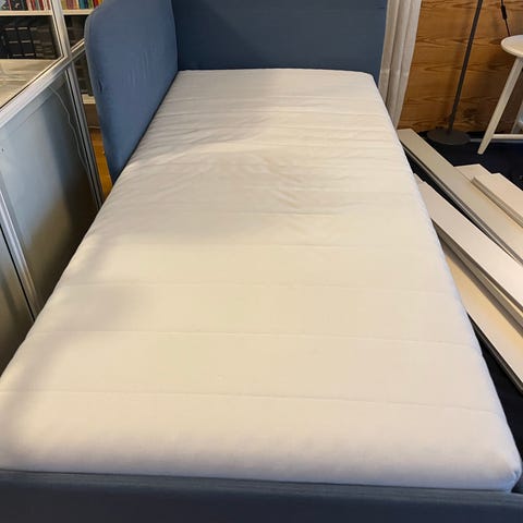 Säljer en praktisk och stabil gästsäng/dagbädd i storlek 80x200 cm. Klädd i ett snyggt grått tyg och med träbotten/ribbor som ger bra stöd. Perfekt som extra säng i gästrum, barnrum eller mindre lägenhet.