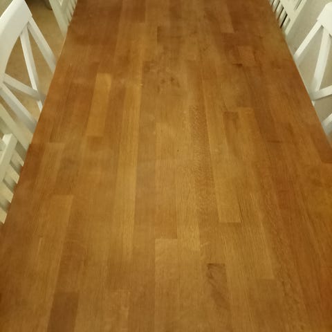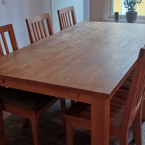 Ekbord, okänt varumärke, välanvänt och med grå avfärgning från stolarnas handtag. Stolar inköpta på Ellos, bra skick, mindre slitage.