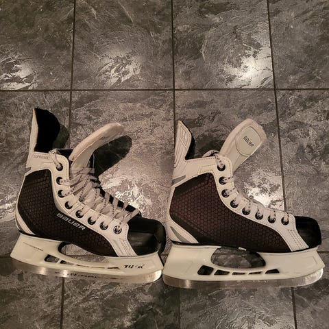 Nike ishockeyskridskor för barn i storlek 38, utrustade med TUUK-skenor och modell V6. Ett bra skick, synligt använda.