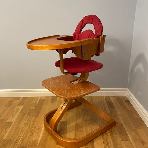 Stokke barnstol med justerbar sits och fotstöd i lila färg. Tillverkad i trä och anpassad för barn.