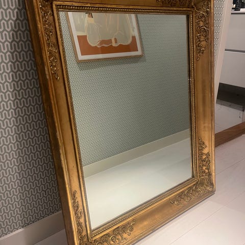 Spegel med guldfärgad ram och dekorativa detaljer. Spegeln har en rektangulär form med rundade hörn och är avsedd för väggmontering.