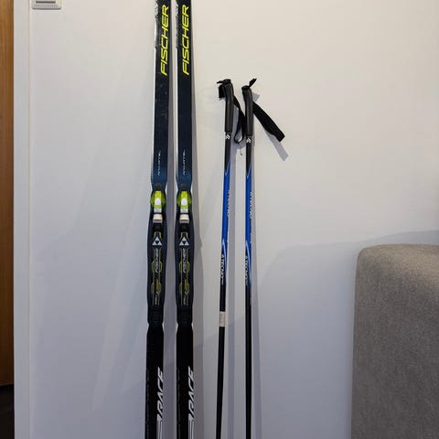 Fischer junior längdskidor med en längd på 170 cm. Skidorna är avsedda klassisk stil, är vallningsfria med fjiskfjällstruktur i spannet samt utrustade med flyttbara bindningar för justering av glid/fäste. Knappt använda då barnen tyvärr aldrig blev intresserade av längdåkning. Se bild för specs.