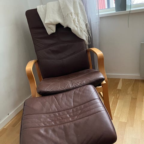 Svart skinnfåtölj ca 18 år gammal. Bra skick men en del märken på sitsen.
