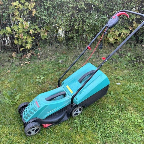 Gardena elektrisk gräsklippare i blå färg. Utrustad med handtag och uppsamlare för gräs. Passar för trädgårdsarbete och gräsklippning.