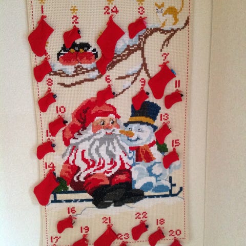 Broderad Adventskalender som används varje år. . Kalendern har 24 julstrumpor för att räkna ner dagarna till jul. 120x75cm… perfekt skick