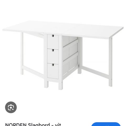 Grått bord /slagbord med två vita stolar. När båda skivorna är nedfälld (bild 1): 60cm, ena skivan (bild 2): 120cm, båda skivor (bild 3): 180cm. Ytan nött på några ställen. Finns vid Mariatorget