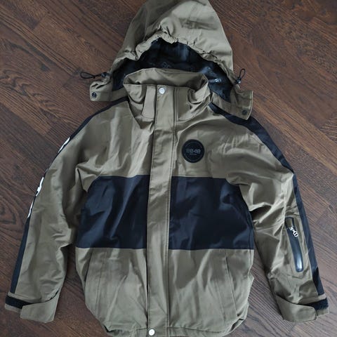 Fin kvalitetsjacka med foder, snölås och avtagbar luva. Små märken nedre del framsida som jag inte får bort (se sista bild).