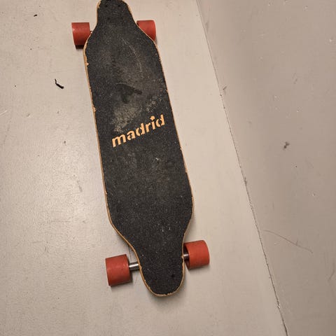Longboard med en färgglad och mönstrad design. Passar för skateboarding och cruising på olika underlag.