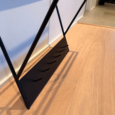 Svensktillverkad hatthylla i ek. Kombinationen av massivt trä och slipat stål är det som sätter prägeln för serien. Hatthyllan har ett hyllplan och klädstång med plats för galgar.