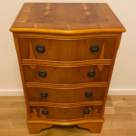 Byrå i engelsk stil med patina. Fina beslag. Synligt använd men inget trasigt.