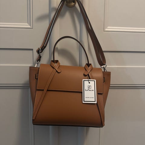 Äkta portfölj i brunt läder. Väskan har ett handtag och ett rymligt inre med ljus foder. Passar för förvaring och transport av personliga tillhörigheter. Får plats med tre laptops.