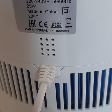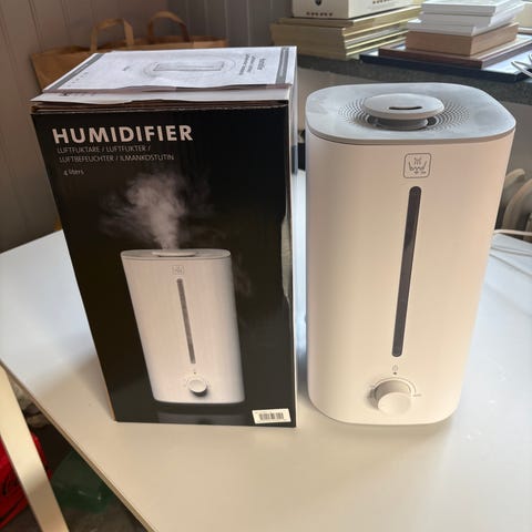 Vicks CoolMist ultrasonisk luftfuktare i blå och vit färg. Enheten är utformad för att ge fuktig luft och lindra hosta och förkylningssymptom med synlig fukt. Luftfuktaren har en enkel ratt för inställning av fuktighetsnivå och är kompakt i storlek.
