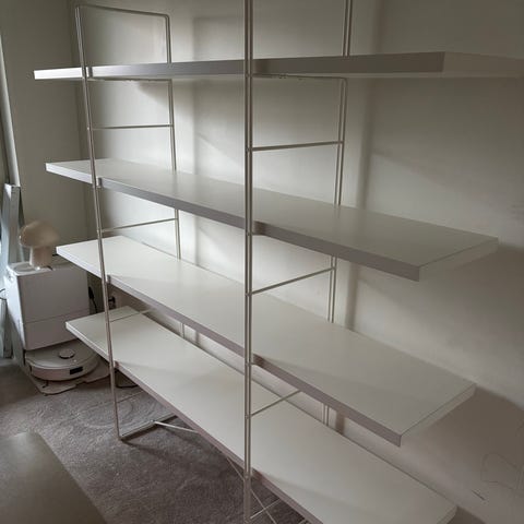 Grå hylla med stålställning. Designad av Niels Gammelgaard för Ikea. Några märken på hyllplanen men inget som stör när den är monterad. Hämtas i centrala Kristianstad.