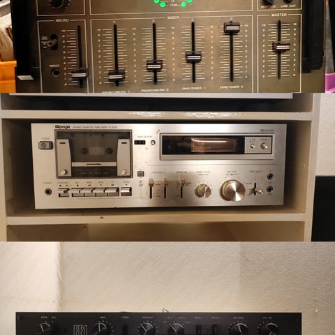 Snygg och välljudande anläggning som spelar lp/cd/dvd/radio. Receiver Panasonic, skivspelare Akai, högtalare Technics. 1900:- finns på Älvsbacka.