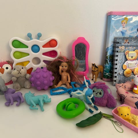 Dottern säljer för att fylla på spargrisen. Bamses honungsjakt, Mimmipussel, Barbies, Mimmifigurer, mm