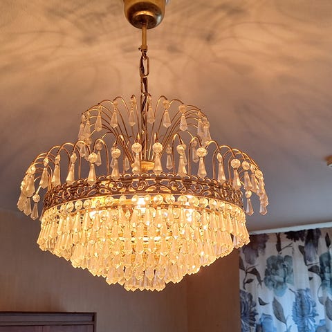 Elegant kristallampa med fyra ljuskällor i mycket fint skick. Ger ett varmt och exklusivt ljus som skapar fin stämning i rummet. Tidlös design som passar perfekt över matbordet, i vardagsrummet eller hallen.