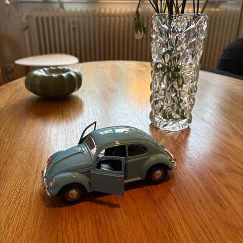 Volkswagen T1 minibil i grön och vit färg. Modellen är en klassisk Volkswagen T1 med detaljer som takräcke och fönster. Passar som samlarobjekt eller dekorationsföremål.kan skickas
