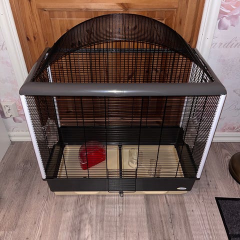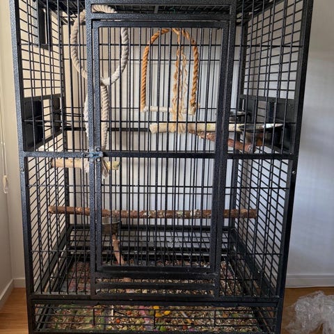 Fågelbur i svart metall med hjul under för enkel förflyttning. Burens design inkluderar flera dörrar för åtkomst och rengöring. Passar för mindre till medelstora fåglar.