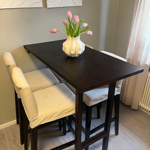 Barstolar från IKEA. Lite sliten klädsel men går lätt att ta bort och tvätta eller byta ut (bl.a. ikea säljer klädsel). Nypris 1295 kr/st