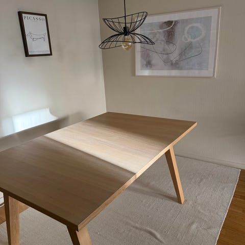Jättefint matbord i valnöst färg, ovalt, ilägsskiva medföljer och 6 jättebekvämma stolar.